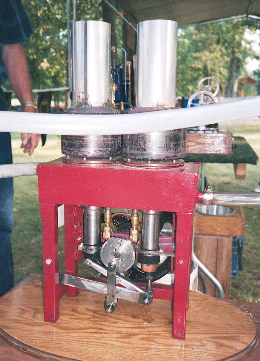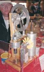 | In addition, Ken had made this V-type Stirling from an old Chrysler freon pump. Unfortunately strong backlighting washed out the detail in the photo :-( but Photoshop LE recovered a bit of the detail. A bonus of taking photos with color negative film - more detail in the shadow areas, and a boon to the careless photographer such as RR | |