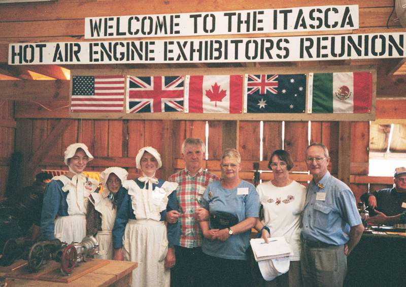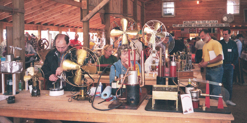 WOW! We are back from the Second International Hot Air Meet at Lake Itasca, Minnesota where there were more hot air engines assembled than ever before! there were full sized engines, model engines, new engines, old engines, serious engines, toy engines. In the words of an old song "We have large ones, small ones, some the size of your 'ead", just a fantastic assembly of hot air engines. And this is just a part of the Lake Itasca Region Pioneer Farmers show that is held annually at their grounds just outside Lake Itasca State Park, the headwaters of the Mississippi!