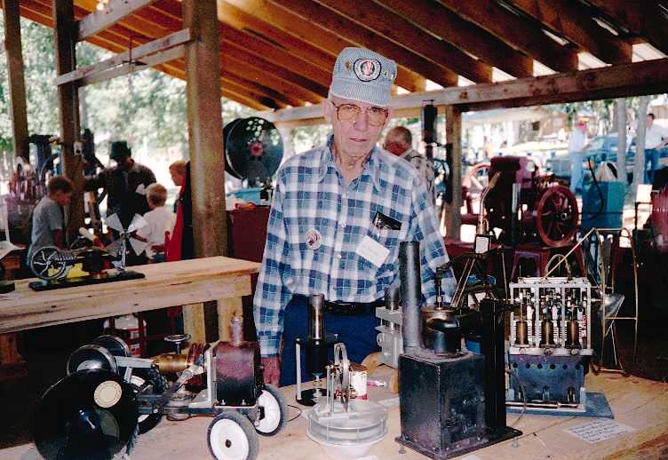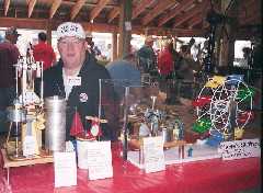 | Sharing the tent with Mauri was Donald Rousse of Cohasset, Minnesota. He claims to be a beginning modeler, but he sure has started big. That's his hand on the flywheel of his concentric engine. Unfortunately, he had an inefficient burner, so the engine was not getting enough heat to run well, even with the additional shielding (the aluminum foil). Alphonse Vassallo gave him some pointers, so there should be some hot times in Cohasset before long! | |