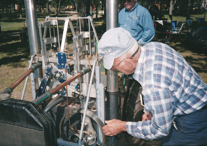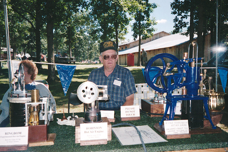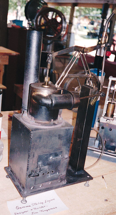 | Mauri Talonen of Bovey, Minnesota was set up outside the Hot Air shed under his own tent. As you can see, he is a skilled craftsman - The Ryder-Ericsson is particularly fine. In addition, Mauri has taken an idea from Ole Berge, and modified it into an unusual engine. | |