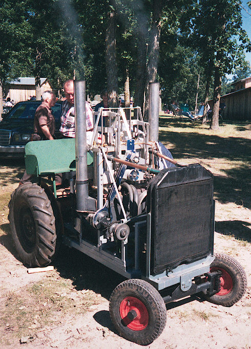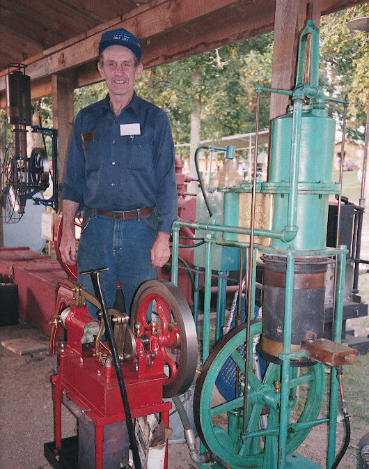|  | And here it is! Ole had found a plan for an unusual engine with a ported power cylinder, and had constructed one per that plan and later had amplified it to a full sized engine (shown in last year's writeup - the vertical engine with the large perforated flywheels) Mauri took that same idea, and made a two cylinder engine. The brass valves in the center just above the flywheel are similar to tire valves and operate twice per power stroke. We will try to have further details on this engine if we can get in touch with Mauri. |