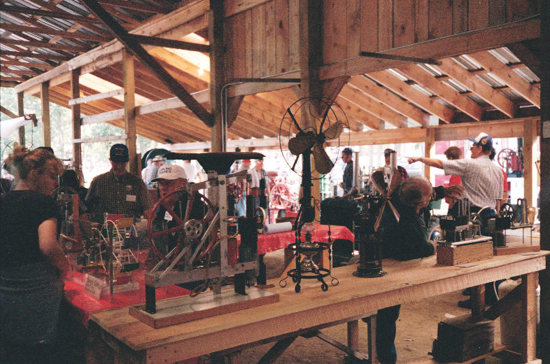 | The west side of the Hot Air Engine Shed was lined with sturdy benches made by Ole and his elves :-) from lumber sawn and planed in the LIRPF sawmill here on the grounds. A view of the sawmill is in last year's report. | |