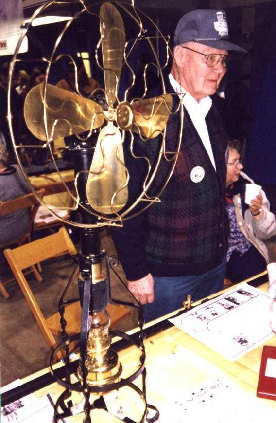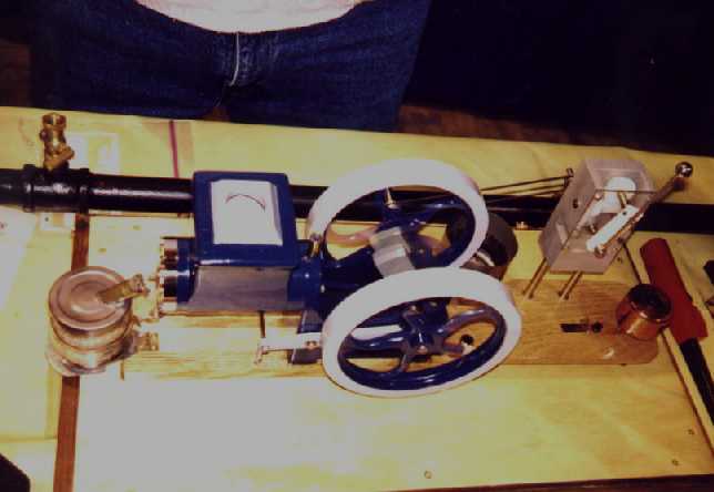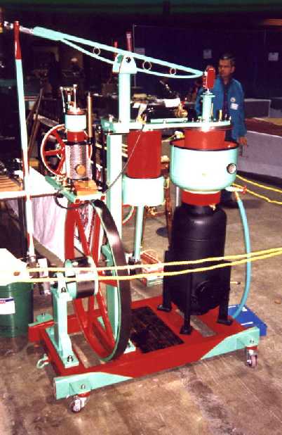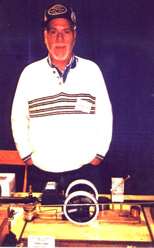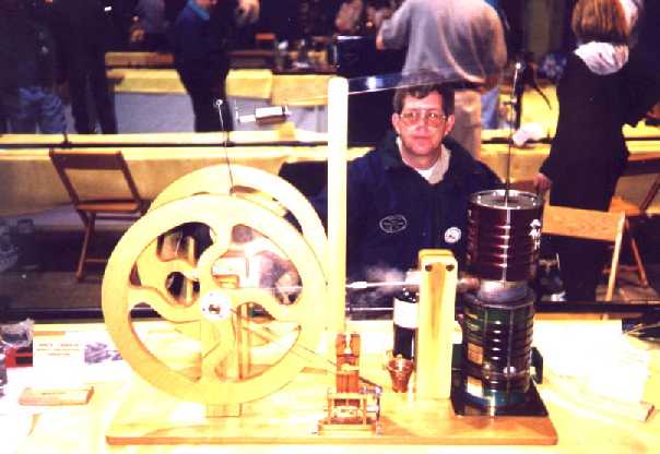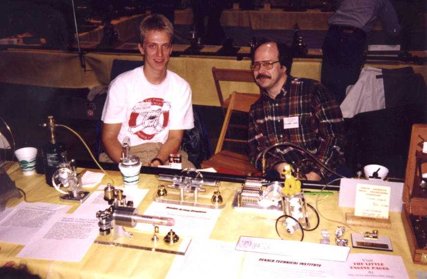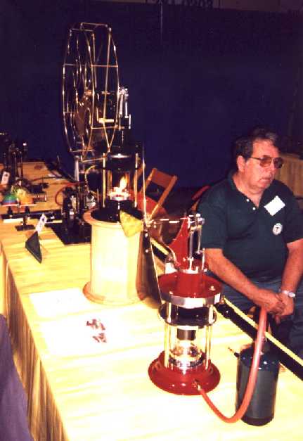 If this music hangs your computer, or if you just don't like it, please email Roy. Your intrepid crew, Roy and Richard, accompanied by Erick Carlson arrived at Wyandotte Friday morning to represent the machine Tool Club of DeKalb Tech. Fortunately for us, an advance contingent from Georgia had arrived earlier that morning and saves us some space. It seems that the NAMES exhibitors are an early rising bunch, and few spaces were left at about 11:30 when we arrived. After setting up our exhibit, there was time to mingle and renew acquaintances, and to see what was new in the exhibits. We did manage to take a few photos, which you will see below. Because of the emphasis of these pages, we show only external combustion engines, mainly Stirlings. this is not to give short shrift to the many other models there, but simply because of our direction. In general, the quality of workmanship at this exhibit is outstanding. The fit and finish of almost all the models was superb. If you have not had the opportunity to see this or the PRIME exhibit, by all means make the time. You will be delighted. Now for the photos, with one last disclaimer: Because an exhibitor should be available at his exhibit to answer questions from the visitors, it is impossible to see every exhibit. I may have overlooked an excellent model, so do not take the omission of a model you saw and appreciated as a slight on our part. Instead, send us the photo and we will run it. Richard and Erick at our exhibit. Erick is a student at DeKalb Tech, as is Roy. Richard is our long suffering instructor! A fine Coffee Can Stirling. We met Larry Lamp who builds and flies ultralight arrcraft when not making coffee. His business card reads: "Appreciator of Mechanical Things." Two beautiful examples of Essex Fans from casting kits by Meyers Model Engine Works show fine craftsmanship by Gary Morgan, of Morgan Tool & Development, Savannah, TN.And after a hard day on the exhibit floor, we all get tired! Another view of the fans. Olaf Berge, the prime mover of the Lake Itasca Hot Air show, and builder of full size replicas of historic Stirling Engines. A Fluidine (Liquid Piston Stirling) was merrily pumping water at the show. Unfortunately, I failed to get the name of the maker. Daryl Webster of Freeland, MD showed a pair of fine Flame Lickers. More details of them below. The first of Daryl's flame Lickers here we see it powering a variety of apparatus. Another of Daryl's Flame Lickers in the style of a Hit&Miss engine. This one is a bell ringer (the bell is on the right!) Bob Hesse turned out a variety of Stirlings, all beautifully machined, and some decorated for the ocassion! Details below... On his right we have the disk drive engine in a LTD configuration. Another LTD by Bob - a real flag waver! Bob's most ambitious engine, fully instrumented(!), and with a VERY long stroke power piston (diagonally on the right of the photo). Although it is not obvious from the photos, almost all Bob's engines feature lost motion inkages on the displacers. This one of Bob's features water cooling and a fine livery of red and white. An overhead flywheel arrangement with coffee can base by Bob. We call this full sized Stirling "Big Daddy" and its smaller sibling (perched on the left) "Little Brother". Again I failed to ger the builder's name. And for our final Stirling, we show an antique engine, made to power a sewing machine, we understand. No, it's not an engine, it's an insect! A mechanical one, that is. It was in a recent issue of Model Engineer, and one of the exhibitors couldn't resist. we may have to have one of our own. We will let you know... Home