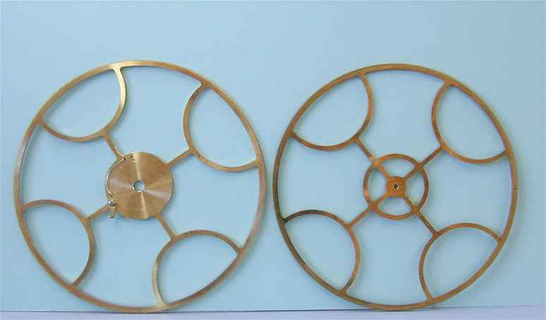 While the great wheel and the center wheel each have 480 teeth, the center (second) wheel is slightly smaller than the great (first) wheel. This is to allow for clearance between the center wheel and the great wheel arbor.