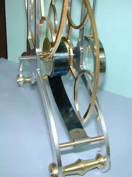 The gear train is driven by a 3/4" x .017" x 120" spring attached to the great wheel allowing the clock to run for one month between windings. The great wheel makes one revolution every 48 hours.