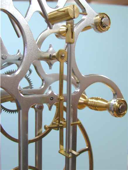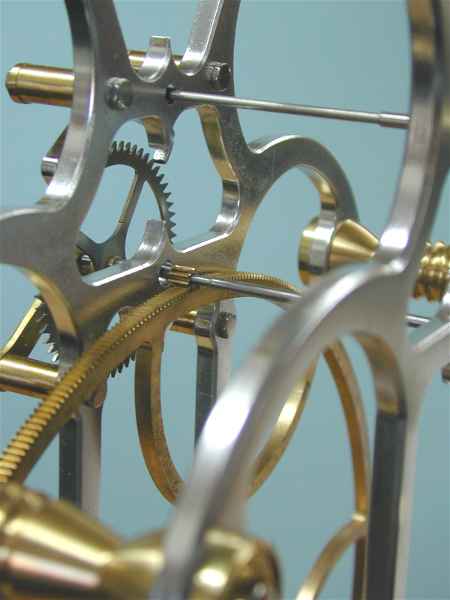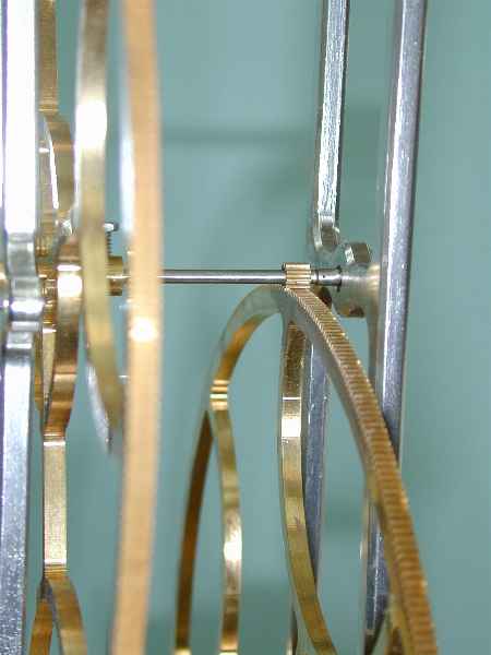 This gear train has two 480 tooth wheels, two pinions, one with 10 teeth and the other with 8, and a 60 tooth escape wheel. Each wheel engages a pinion. In clock terminology, the larger of two gears in mesh is always referred to as the wheel and the smaller gear as the pinion.