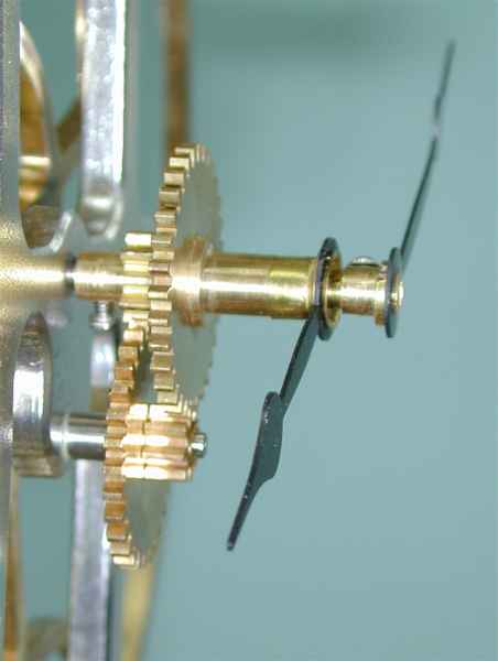 Since the center wheel makes one revolution per hour, the minute hand is attached directly to the center wheel arbor. The motion works are a set of 4 gears that slow the rotation of the hour hand to 1/12 of the speed of the minute hand. In the photo above, a 10 tooth pinion attached to the center wheel arbor drives a 30 tooth wheel. An 8 tooth pinion attached to the 30 tooth wheel drives a 32 tooth wheel. The hour hand is connected to the 32 tooth wheel.