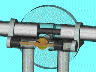 As with "Thumper", Richard's previous Ringbom, the inner workings of this engine will be visible through the use of Pyrex. And again like "Thumper" the power cylinders will oscillate. We have prepared an animation of the running engine. Click here for the animation. (Note - large file size - approximate download time 47 seconds with a 28.8 modem.)What makes this design unique is its double acting displacer pushrod. This feature combined with the two 180 degree opposed power pistons results in an engine that could be pressurized with no crankcase enclosure.